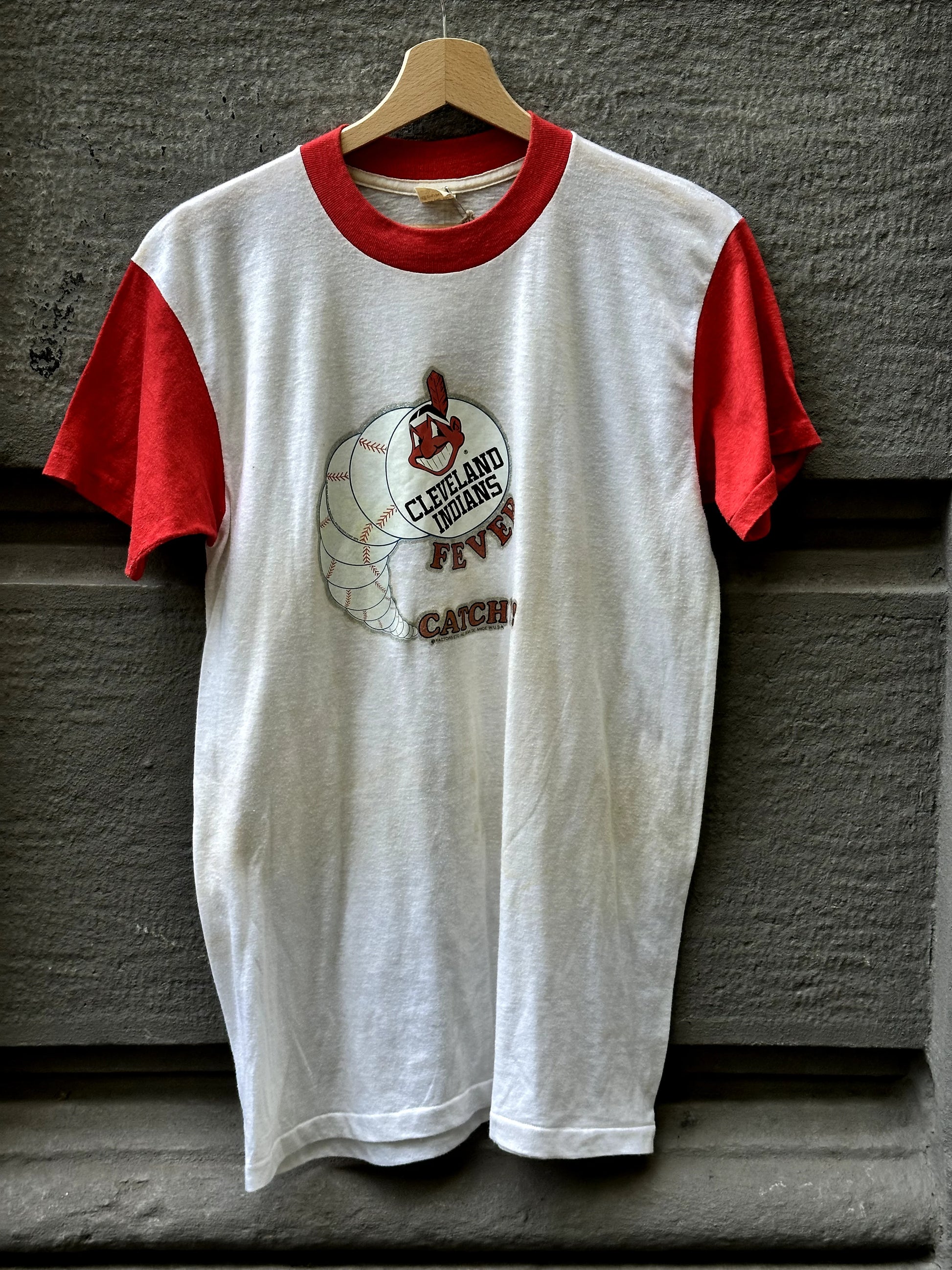 Product details: White body, red sleeves and collar, 'Cleveland Indians Fever' and mascot graphic print on front, vintage single-stitch construction, soft cotton/poly. Brand: Cleveland Indians.